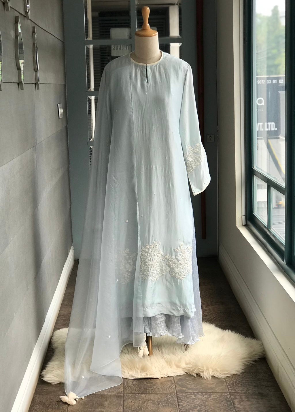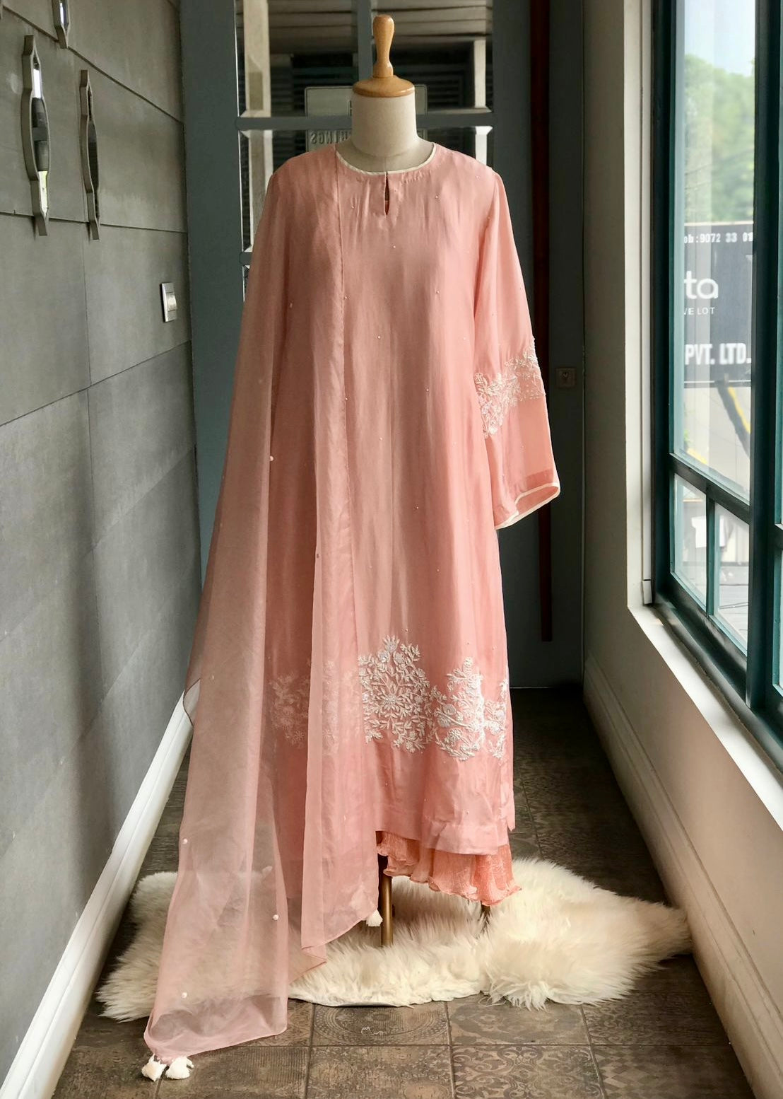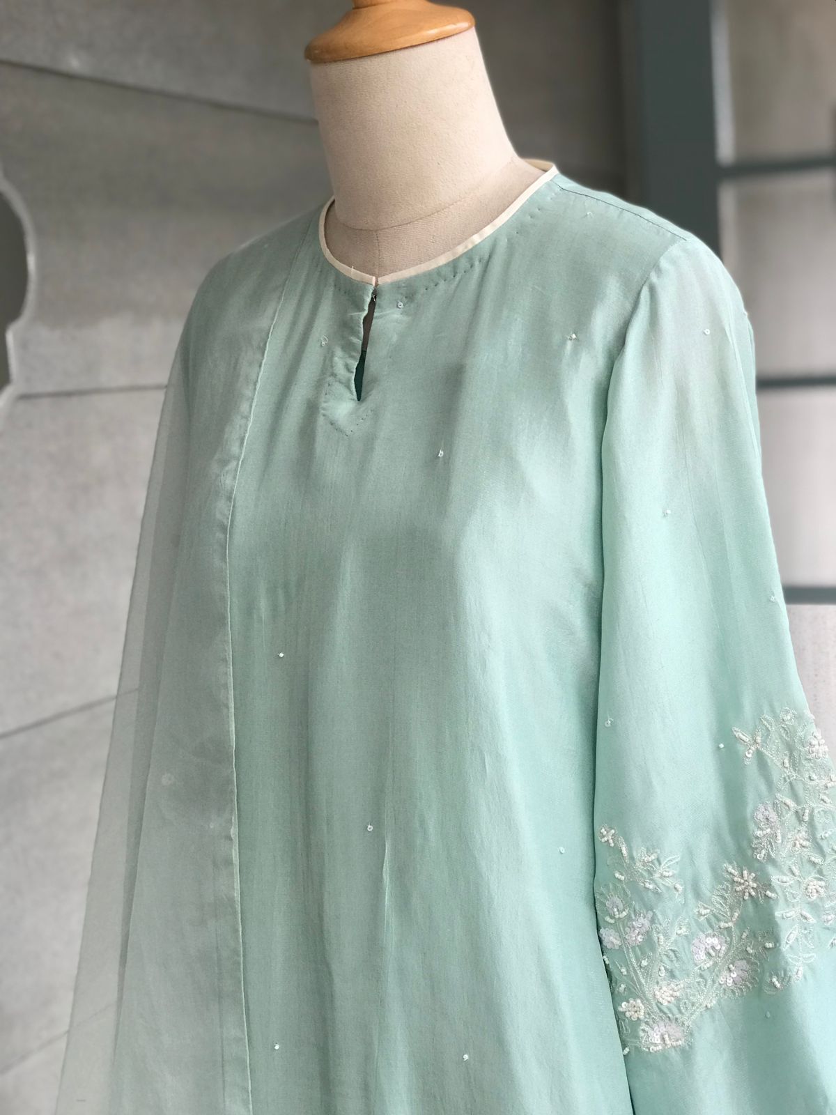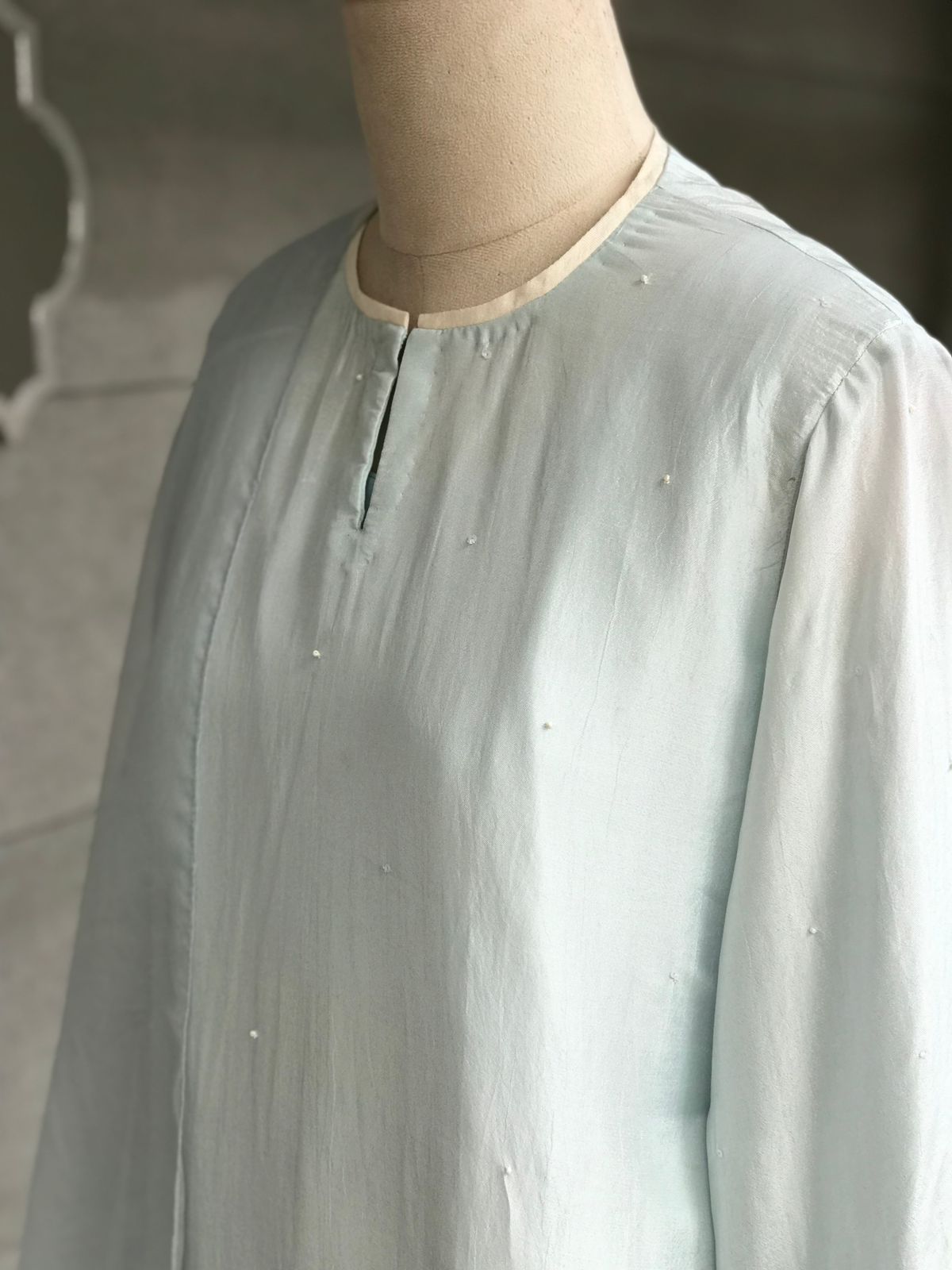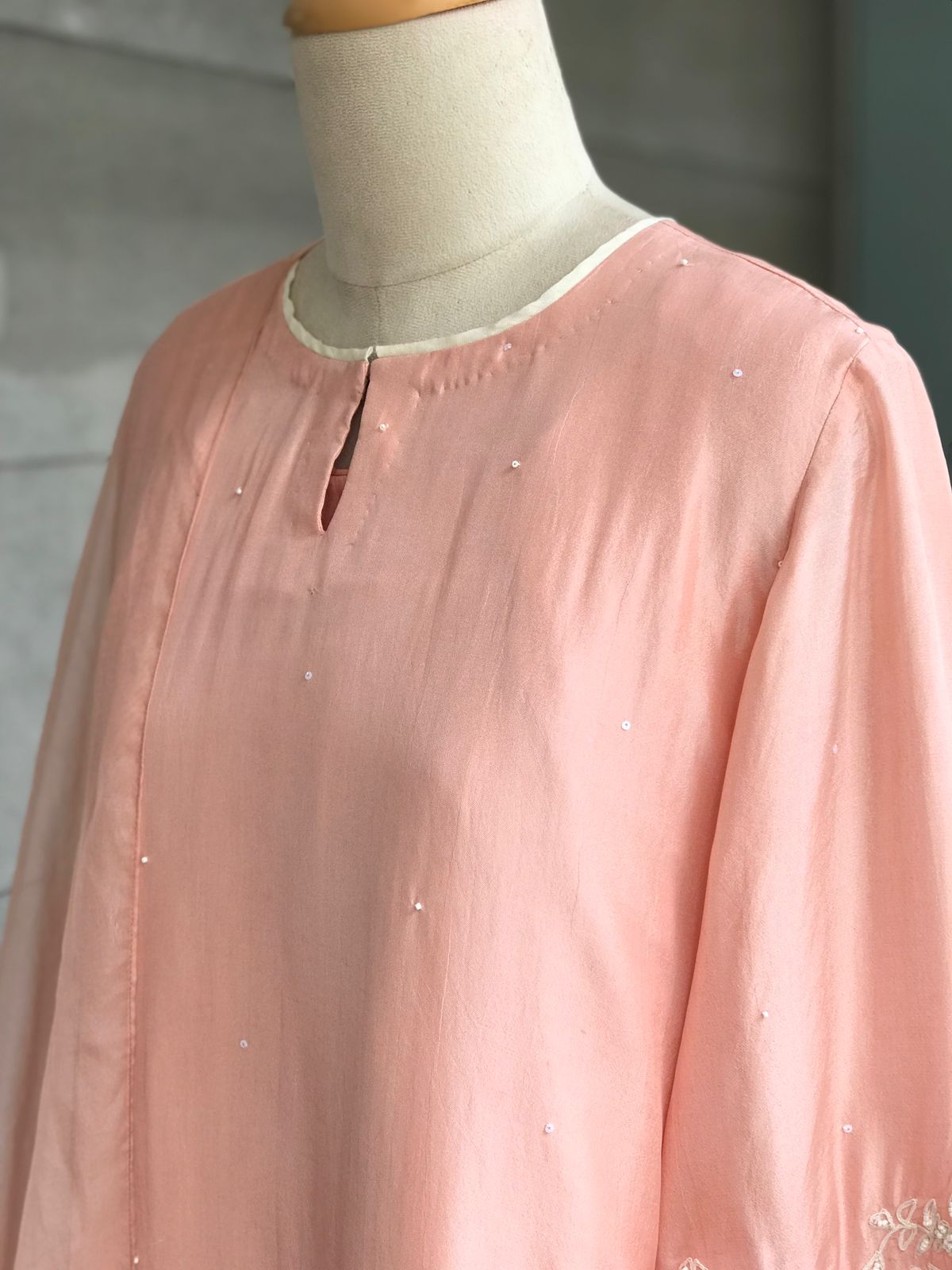 Kurta : A chanderi silk kurta with handworked pearls and sequins on front ghera and sleeves.