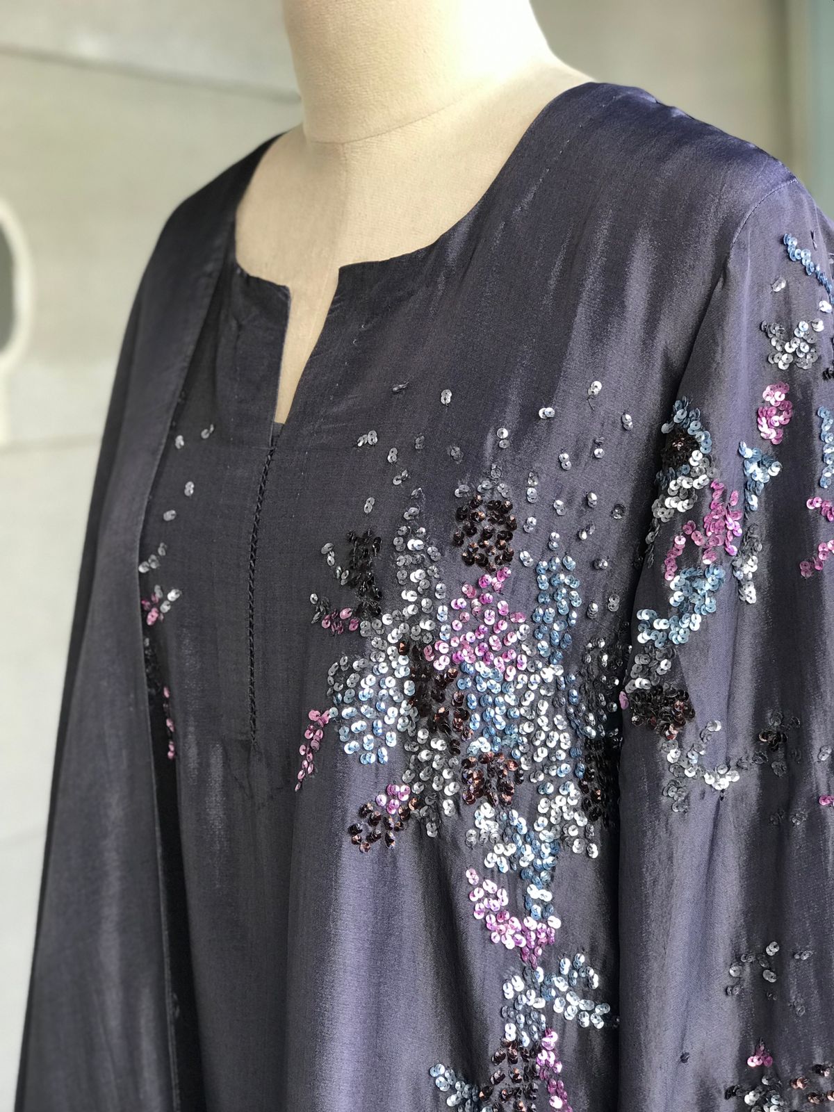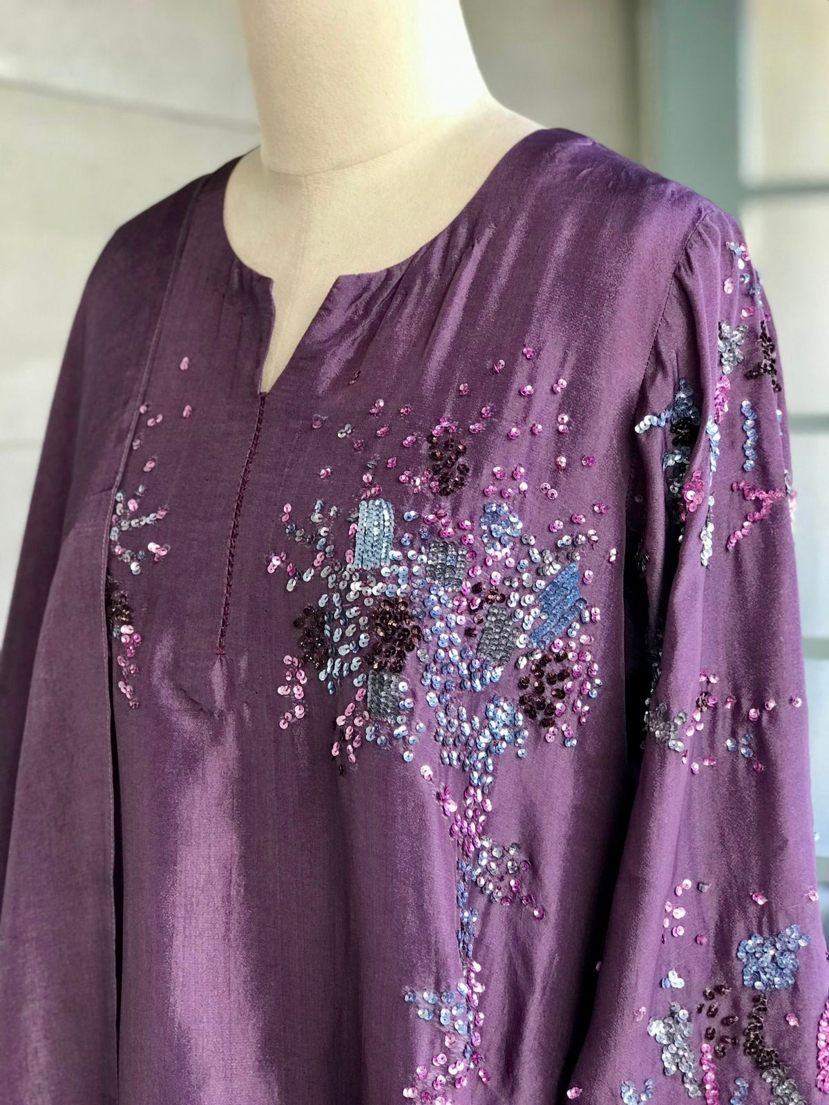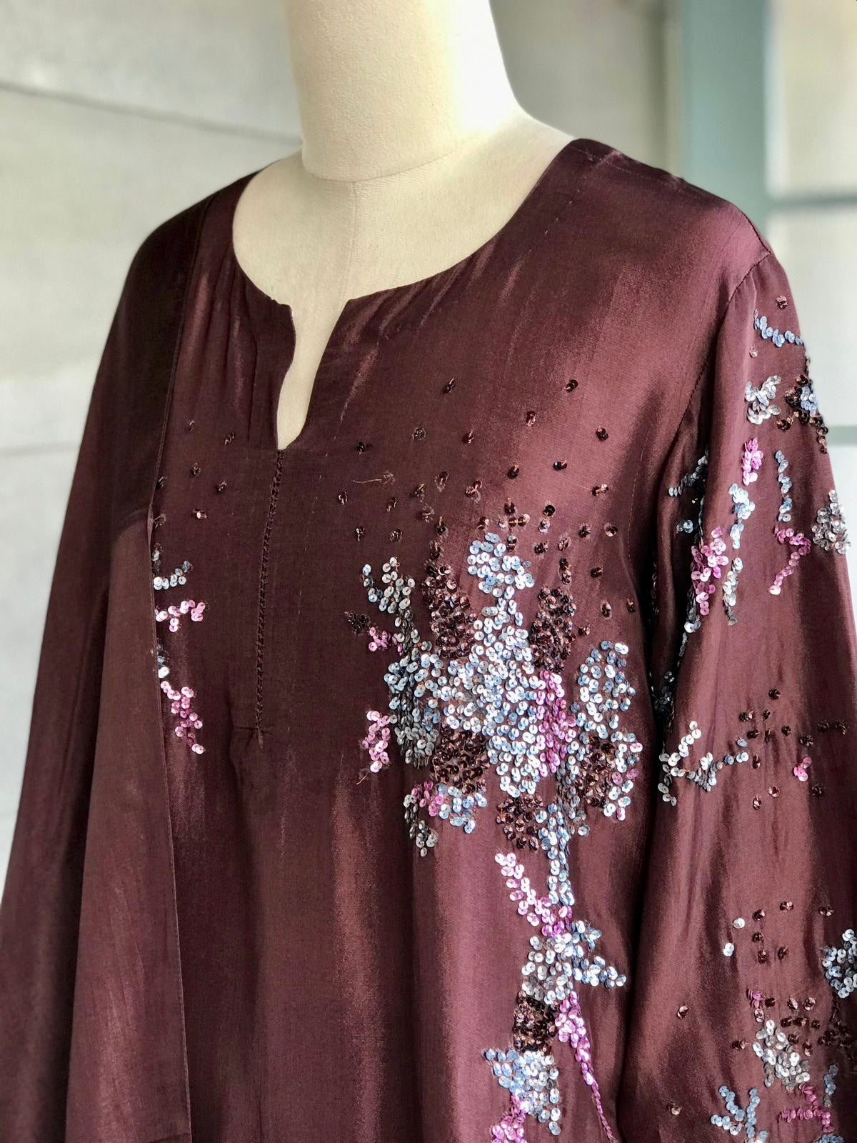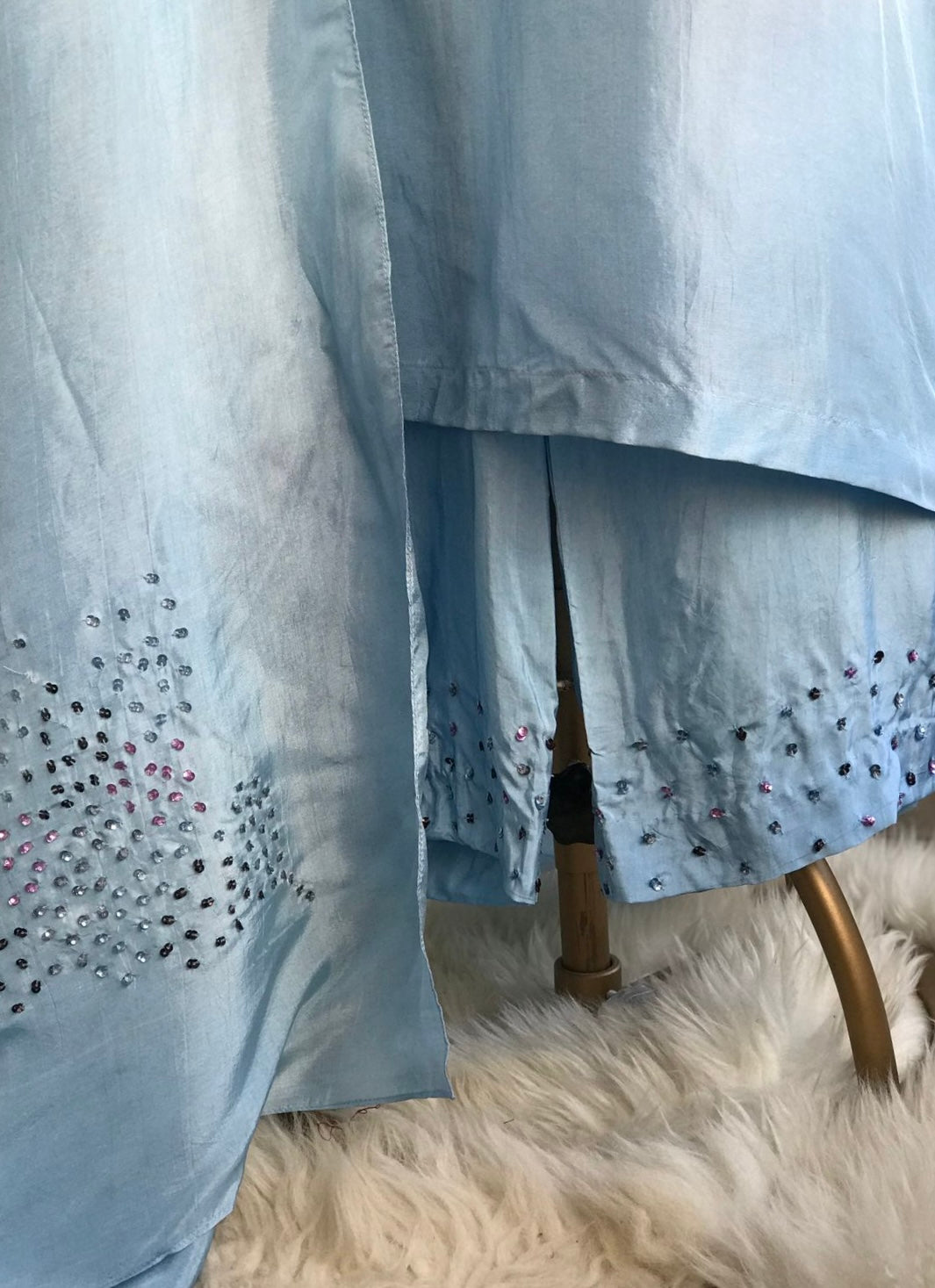 Kurta : Viscose silk kurta with handworked coloured sequins on waist and sleeves.