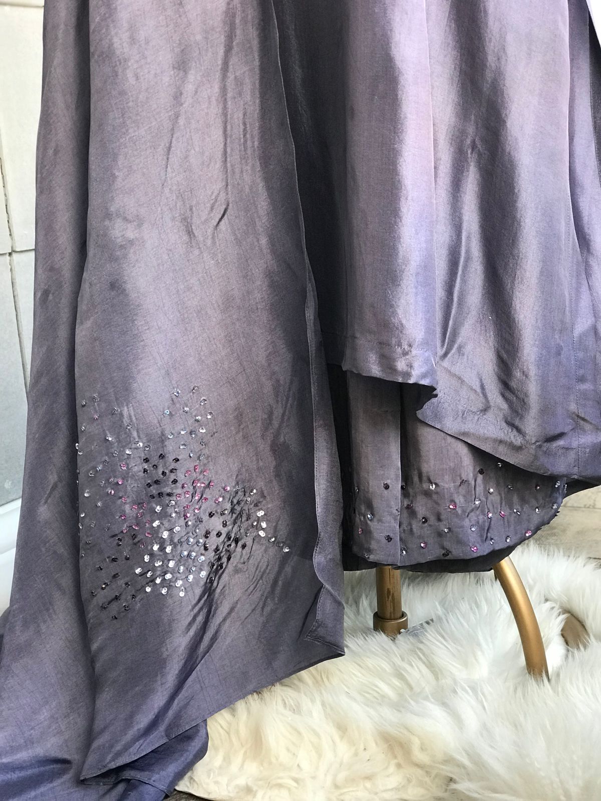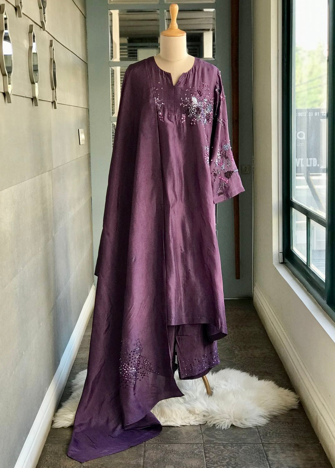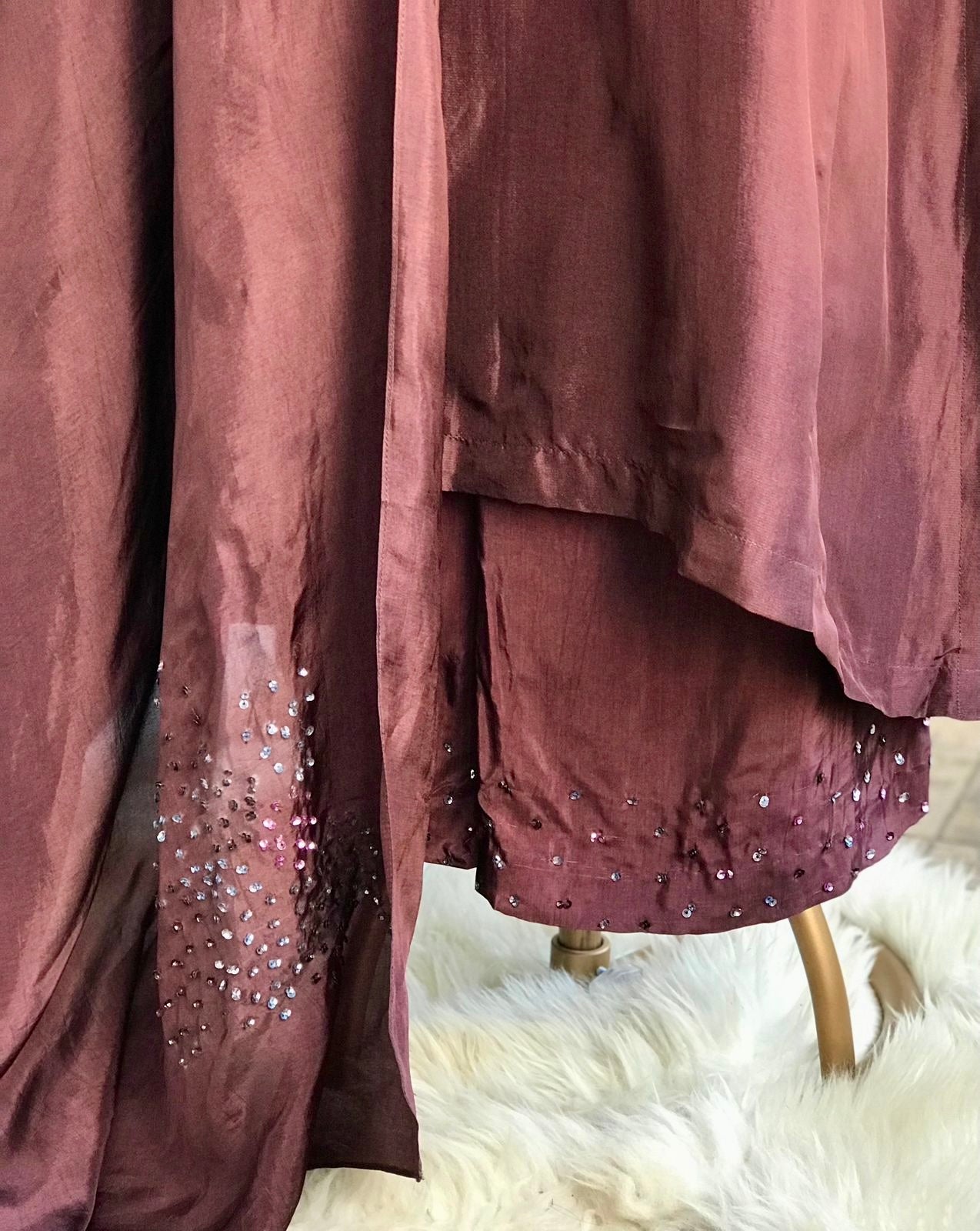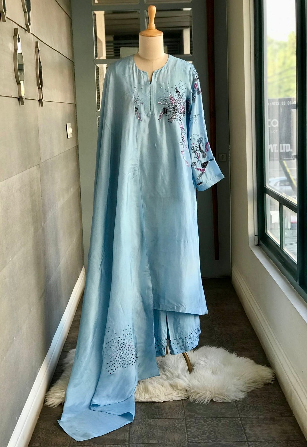 Kurta : Viscose silk kurta with handworked coloured sequins on waist and sleeves.