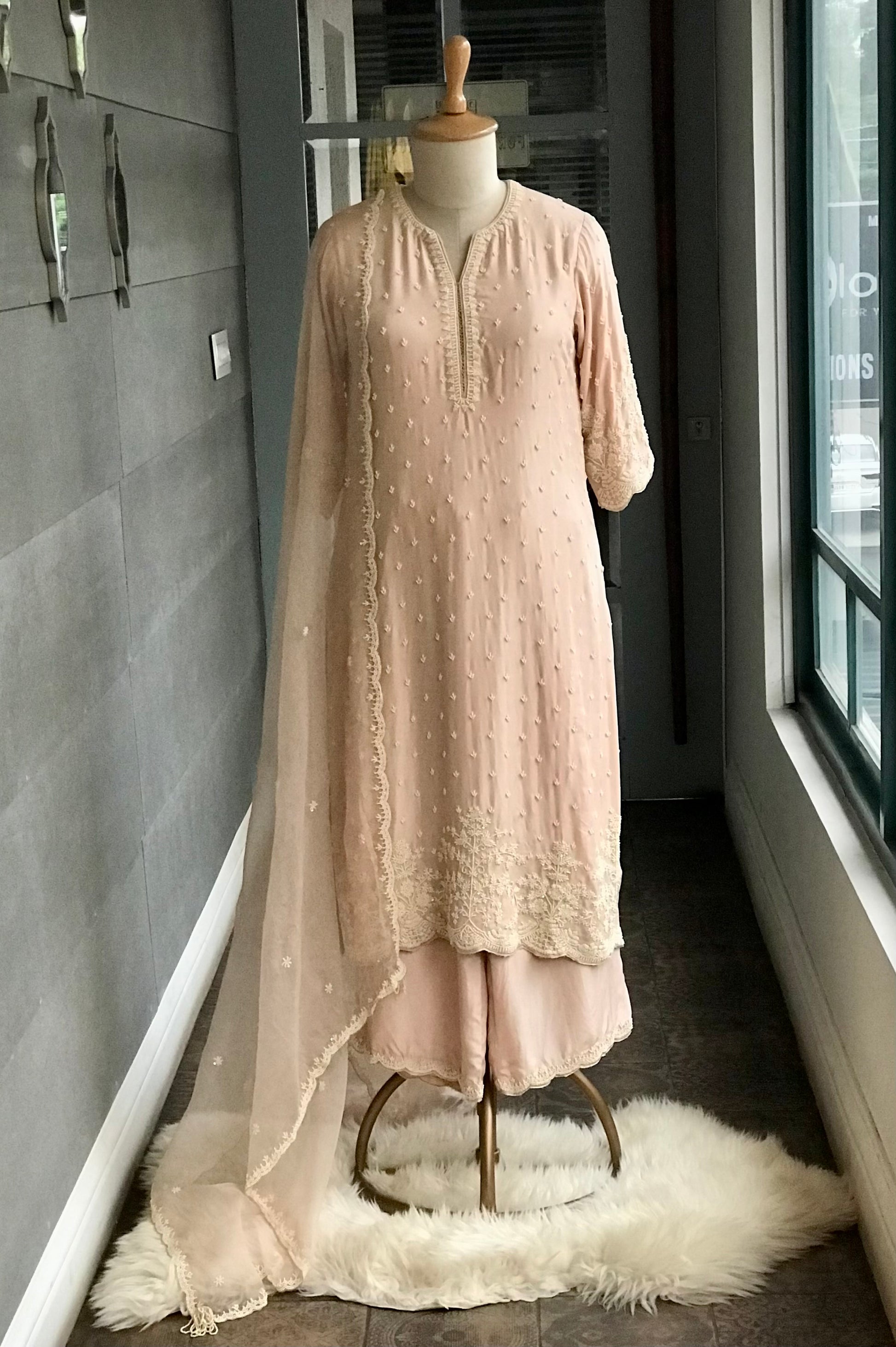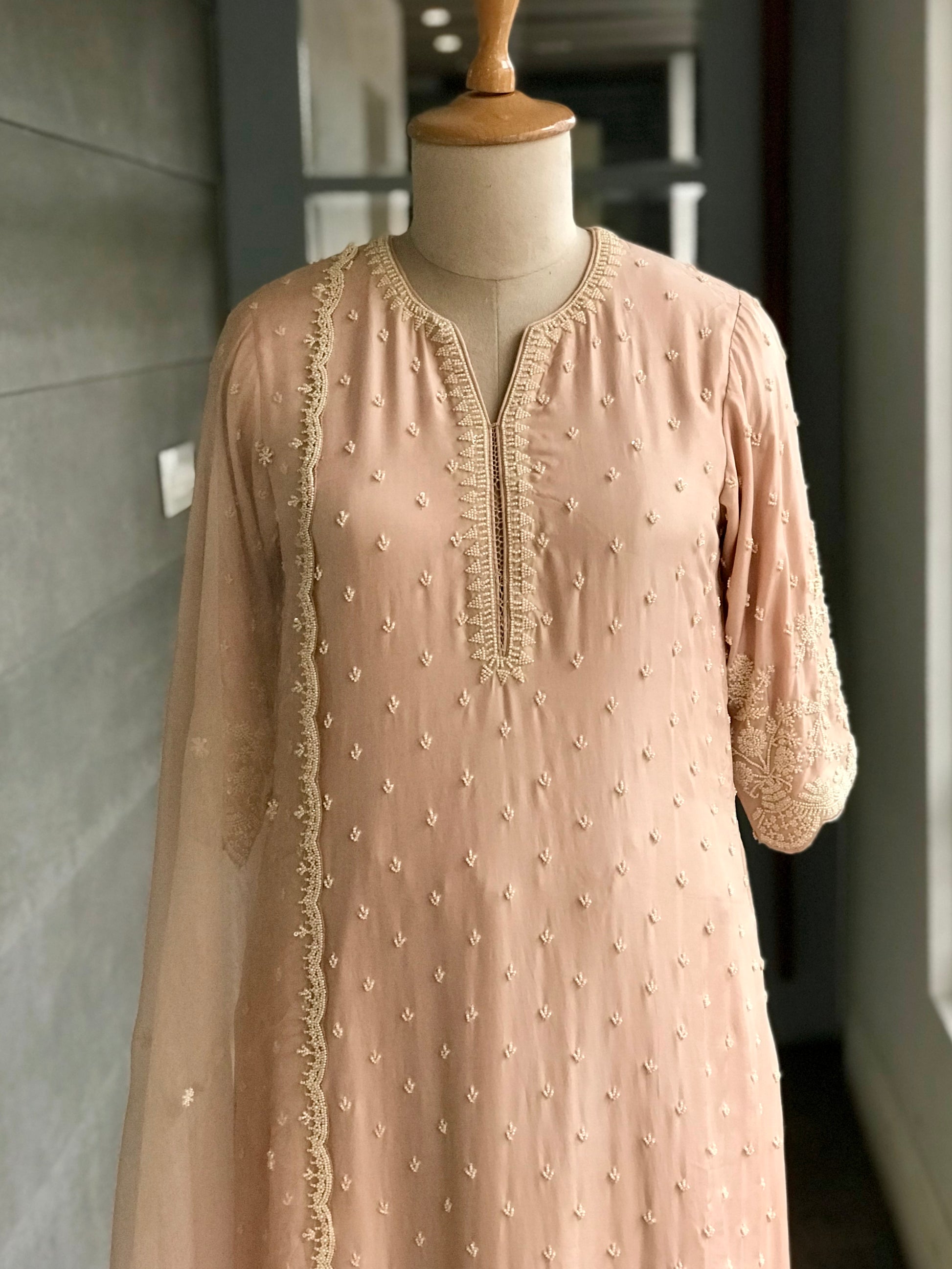 Kurta : Pure Dupion silk salmon pink kurta hand worked with intricate pearl work on front and back.