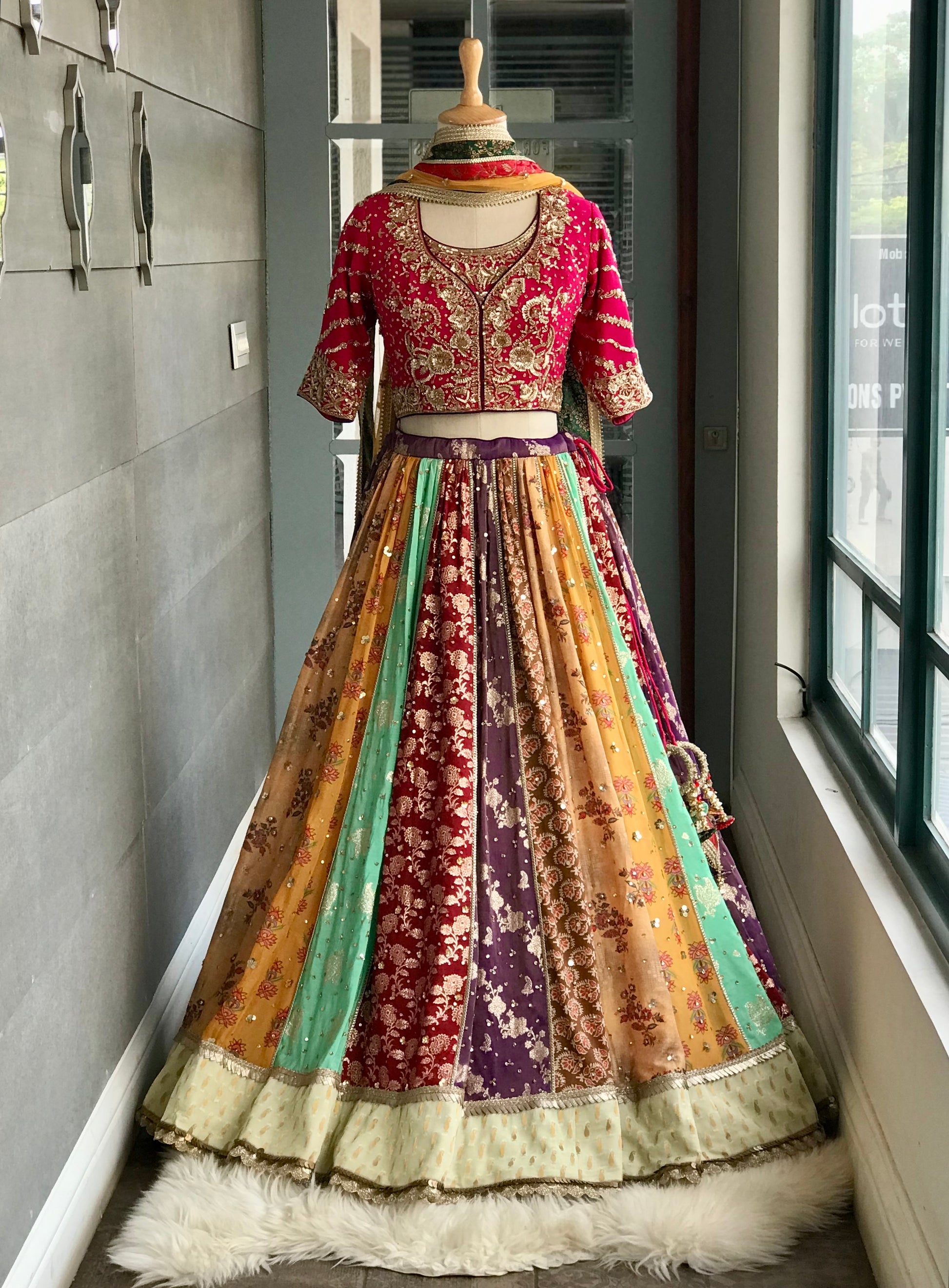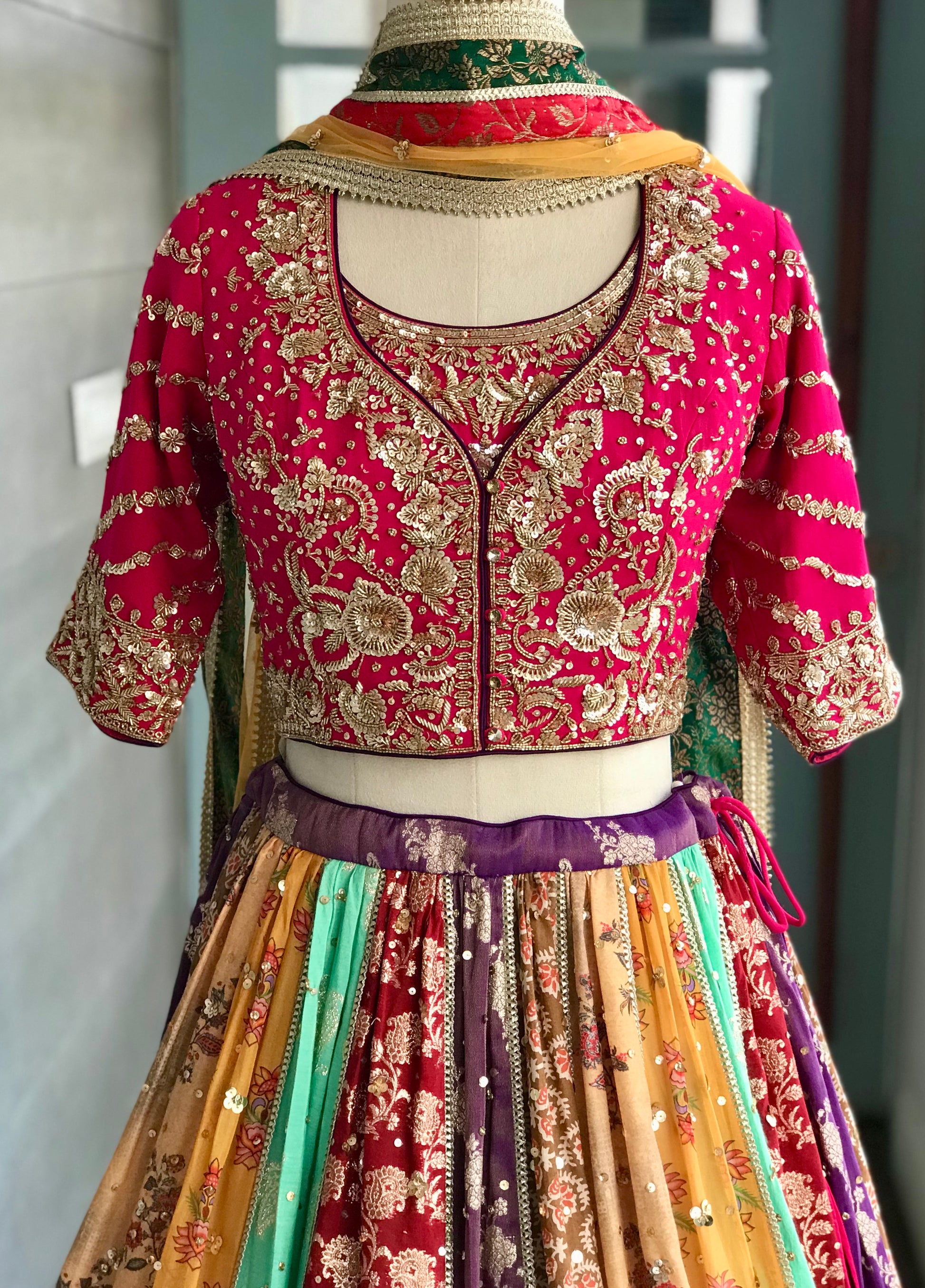 Lehenga : Multi panelled printed fabrics in bright poppy colours highlighted with sequins and readymade borders.
