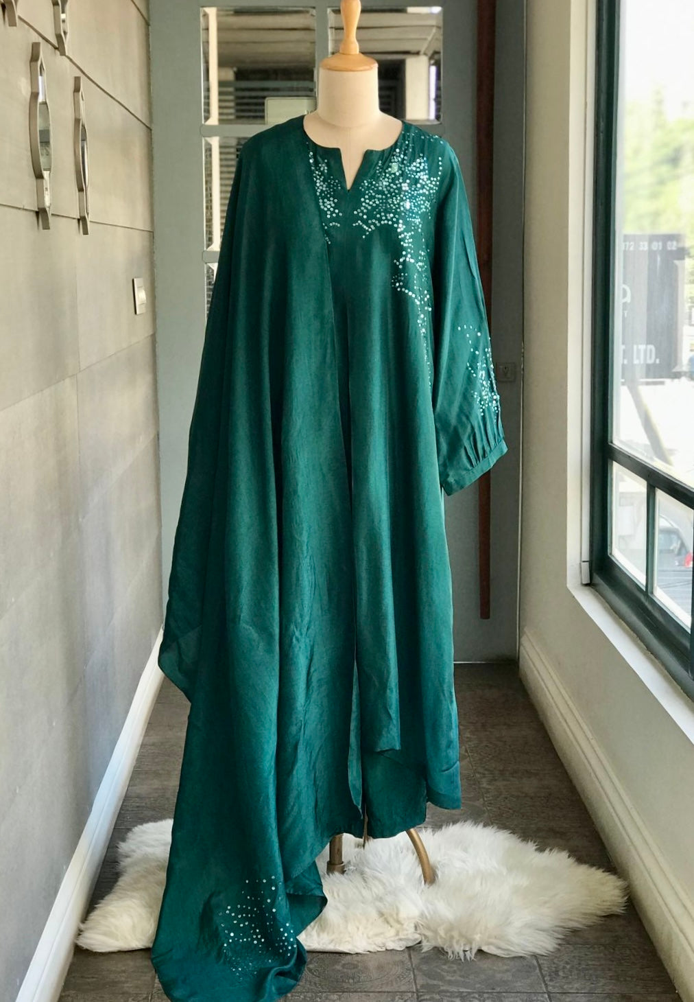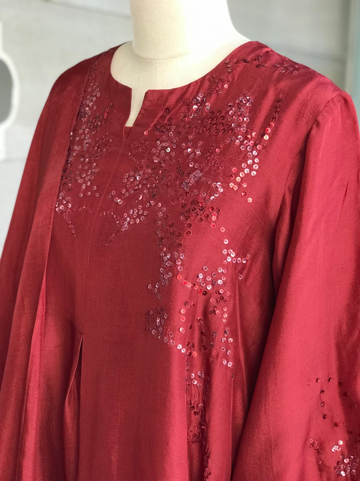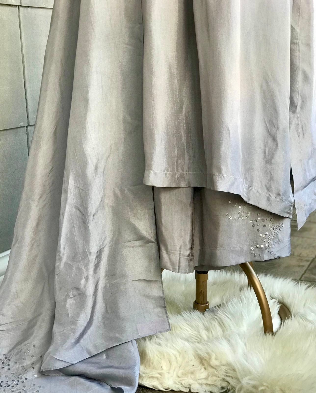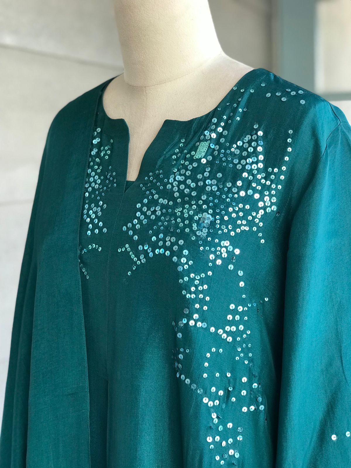 Kurta : Viscose silk kurta with handworked tonal sequins on shoulder and sleeves.