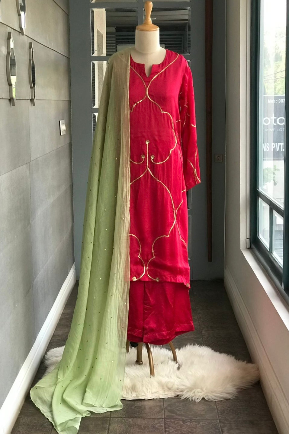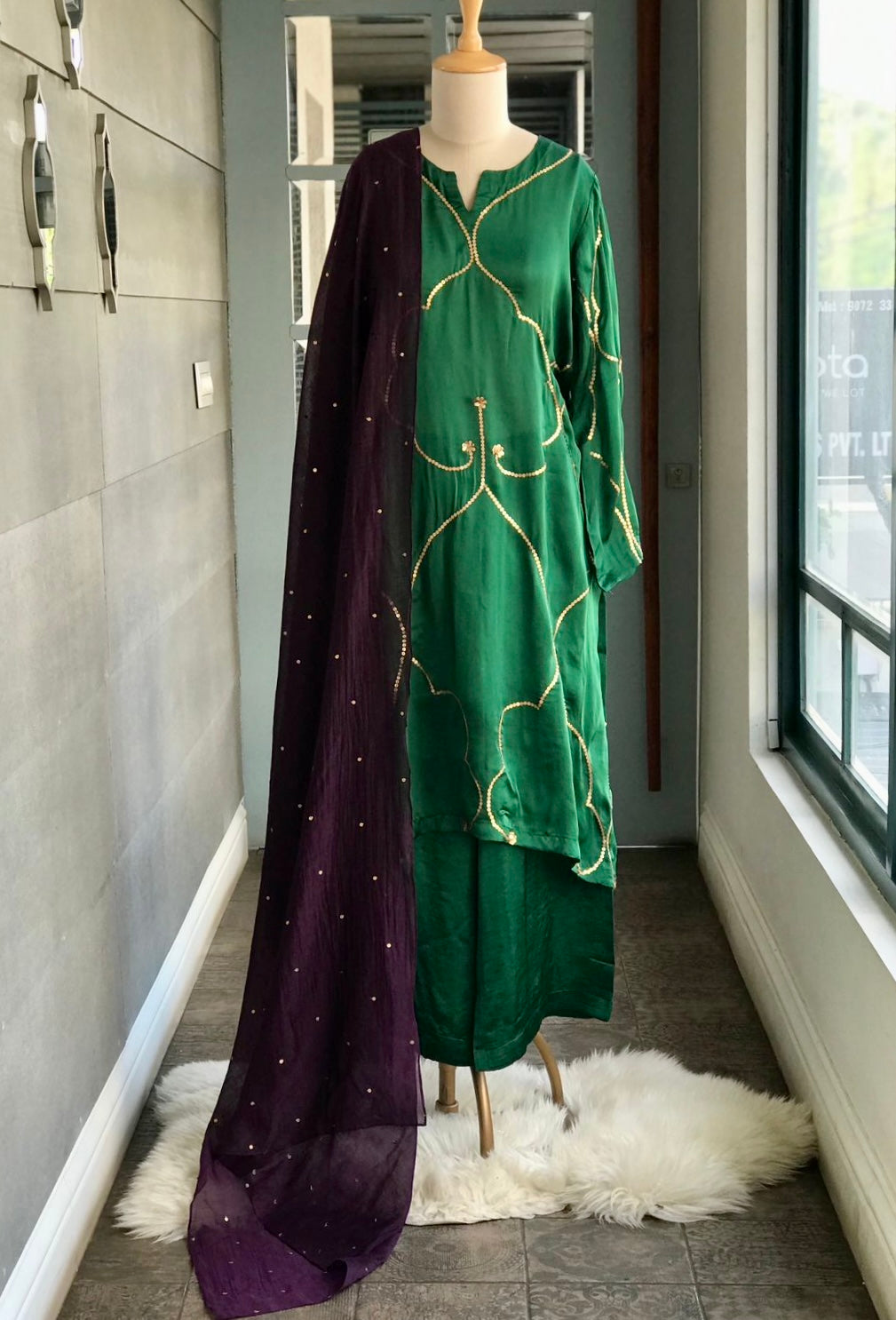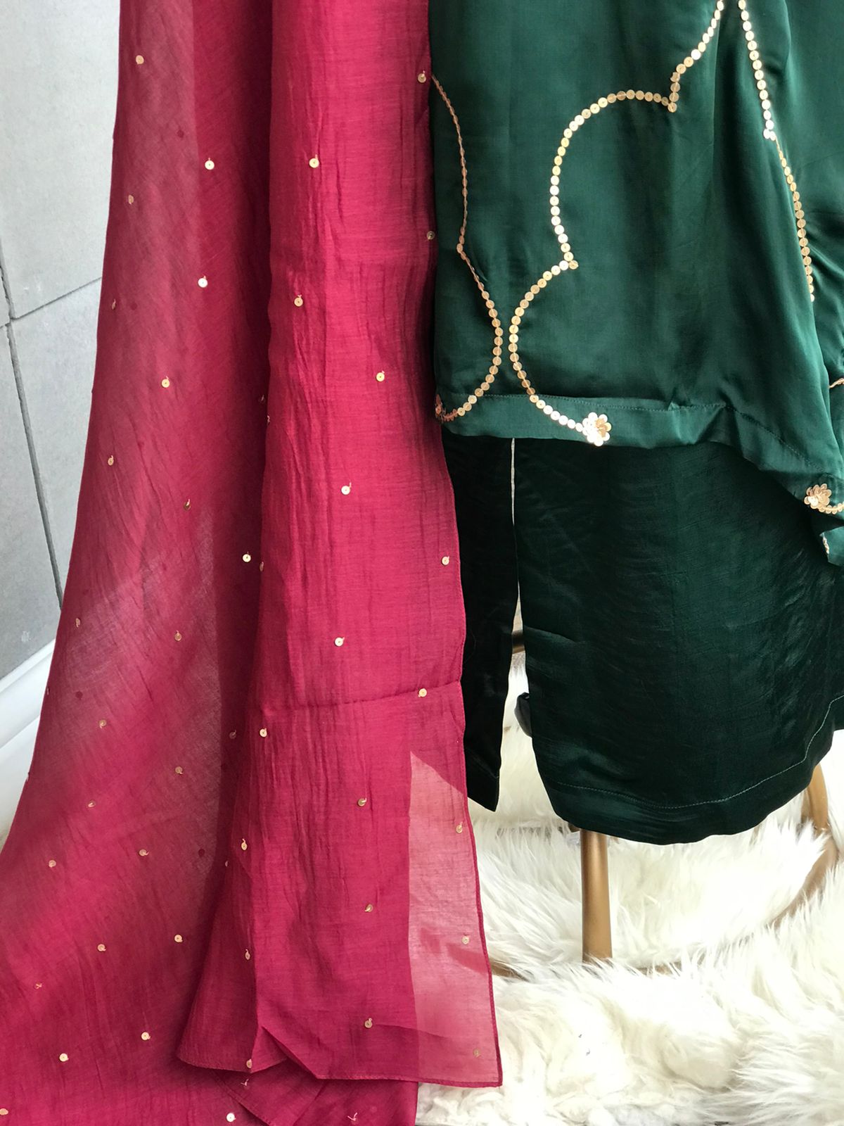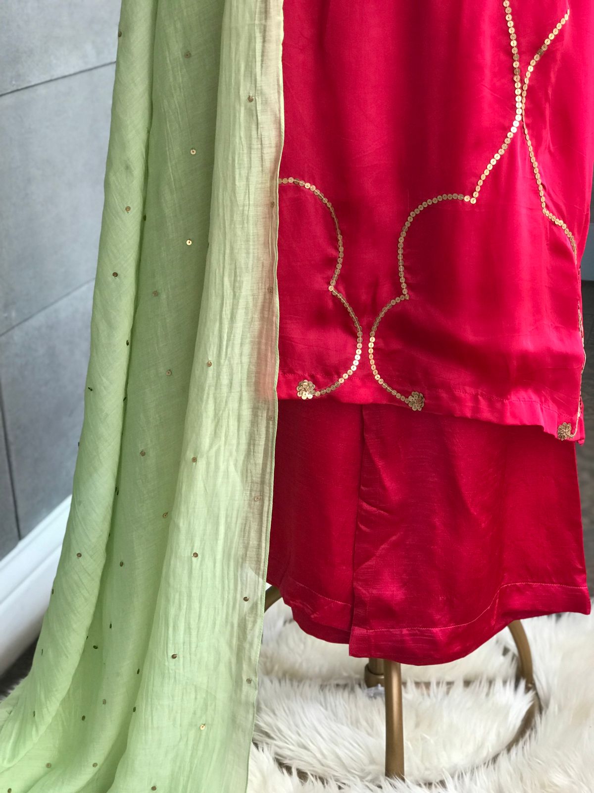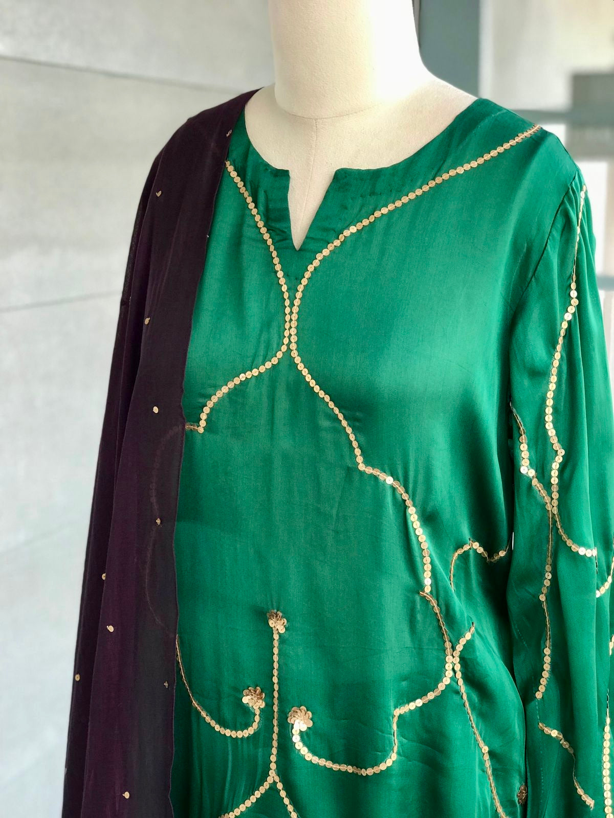 Kurta : Viscose silk kurta with handworked sequins on front and back. Full sleeved.